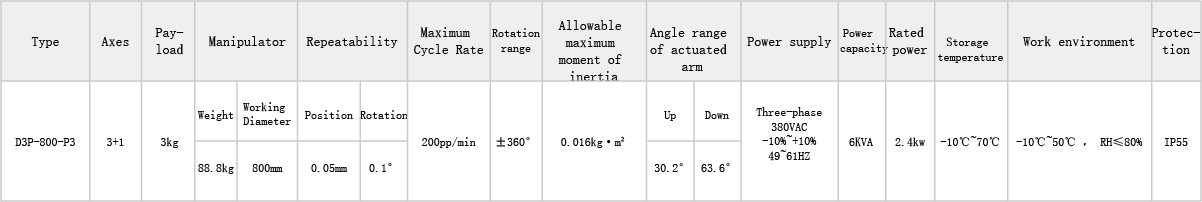 The classic high-speed parallel robot configuration has the functional characteristics of translation along the XYZ axes in three-dimensional space and rotation around the Z axis. By matching with a high-precision machine vision system, it is suitable for high-speed production operations in the food, medicine and other industries. It is mainly used for the assembly, handling and sorting of light and small scattered materials.