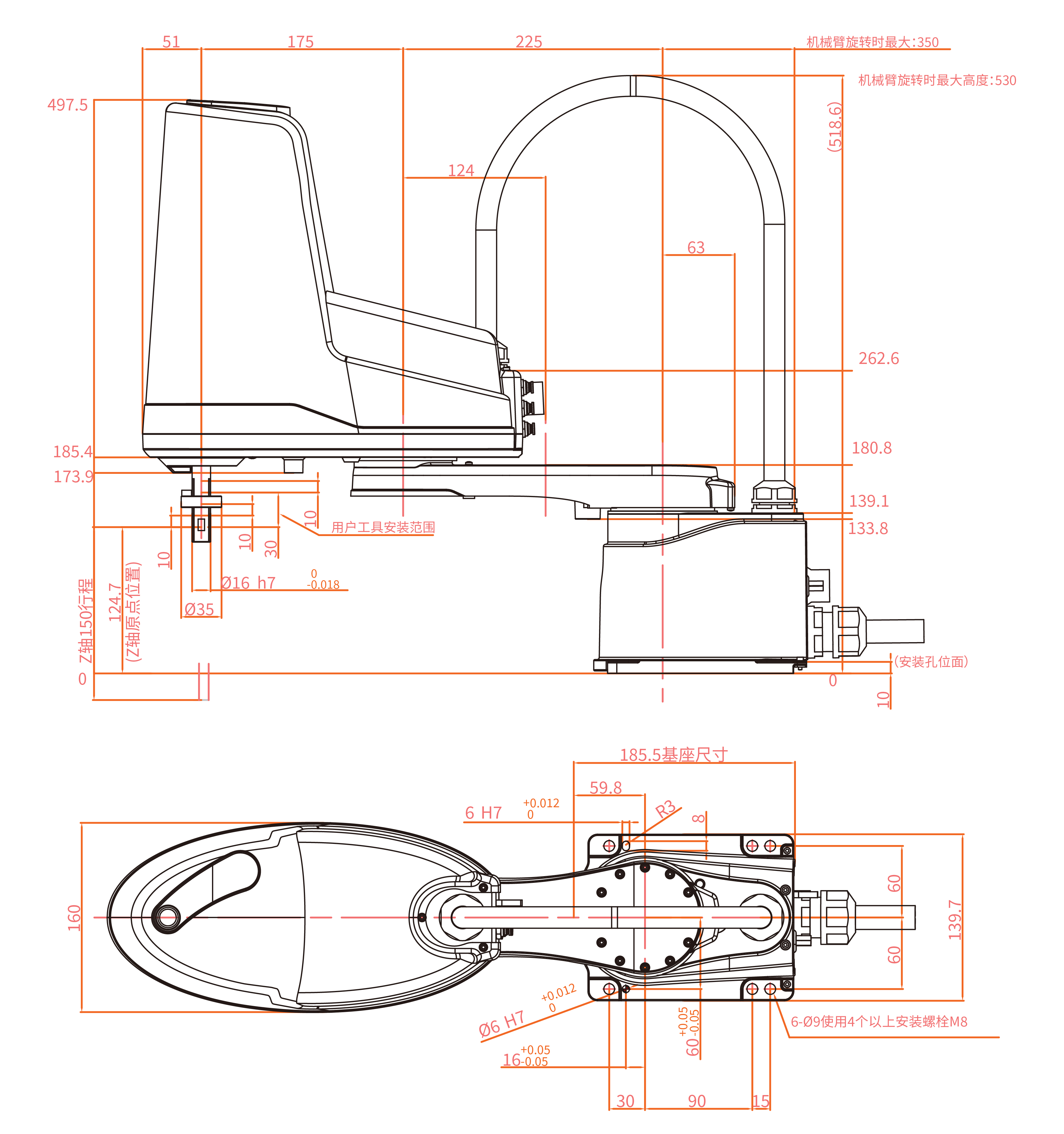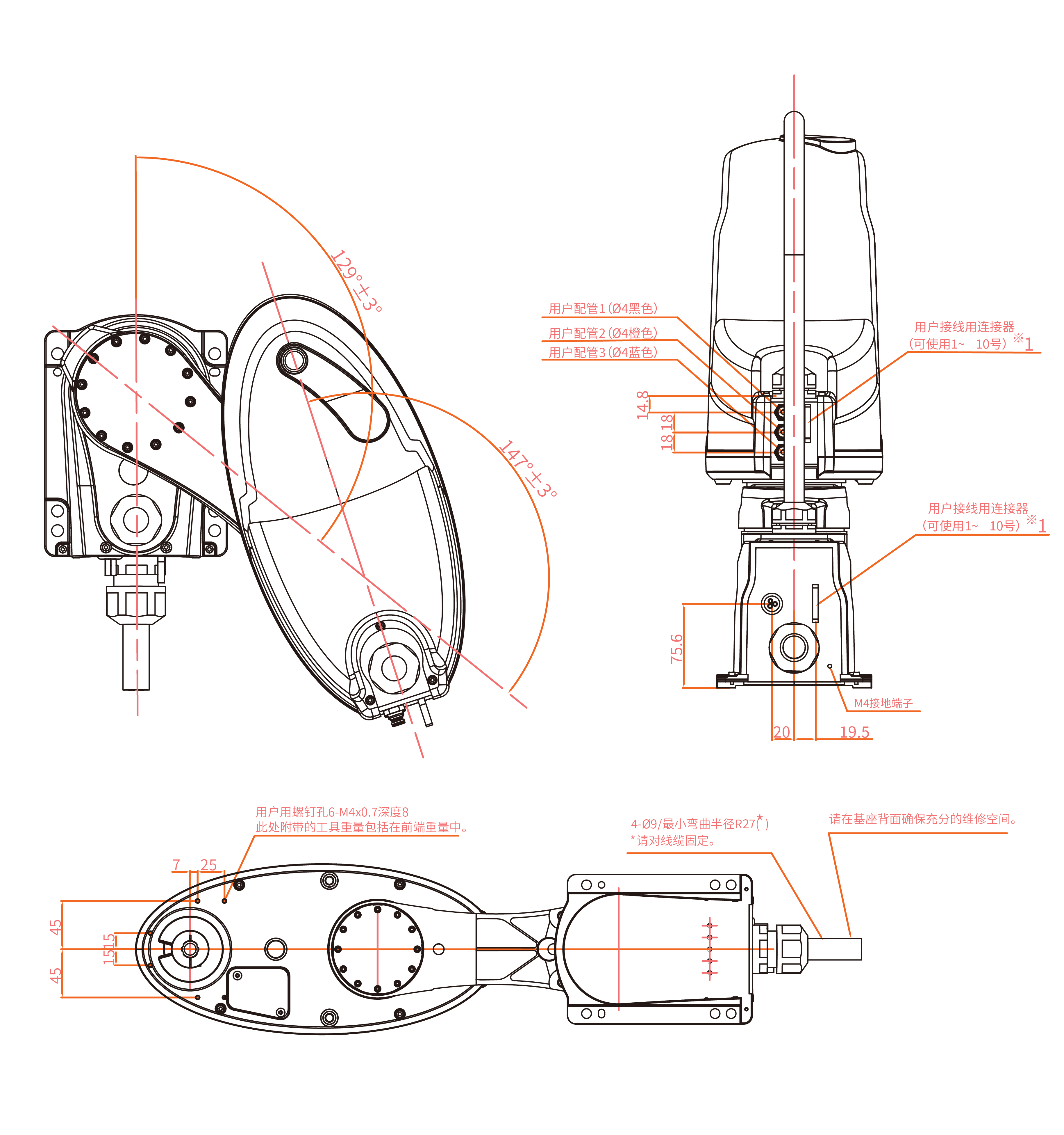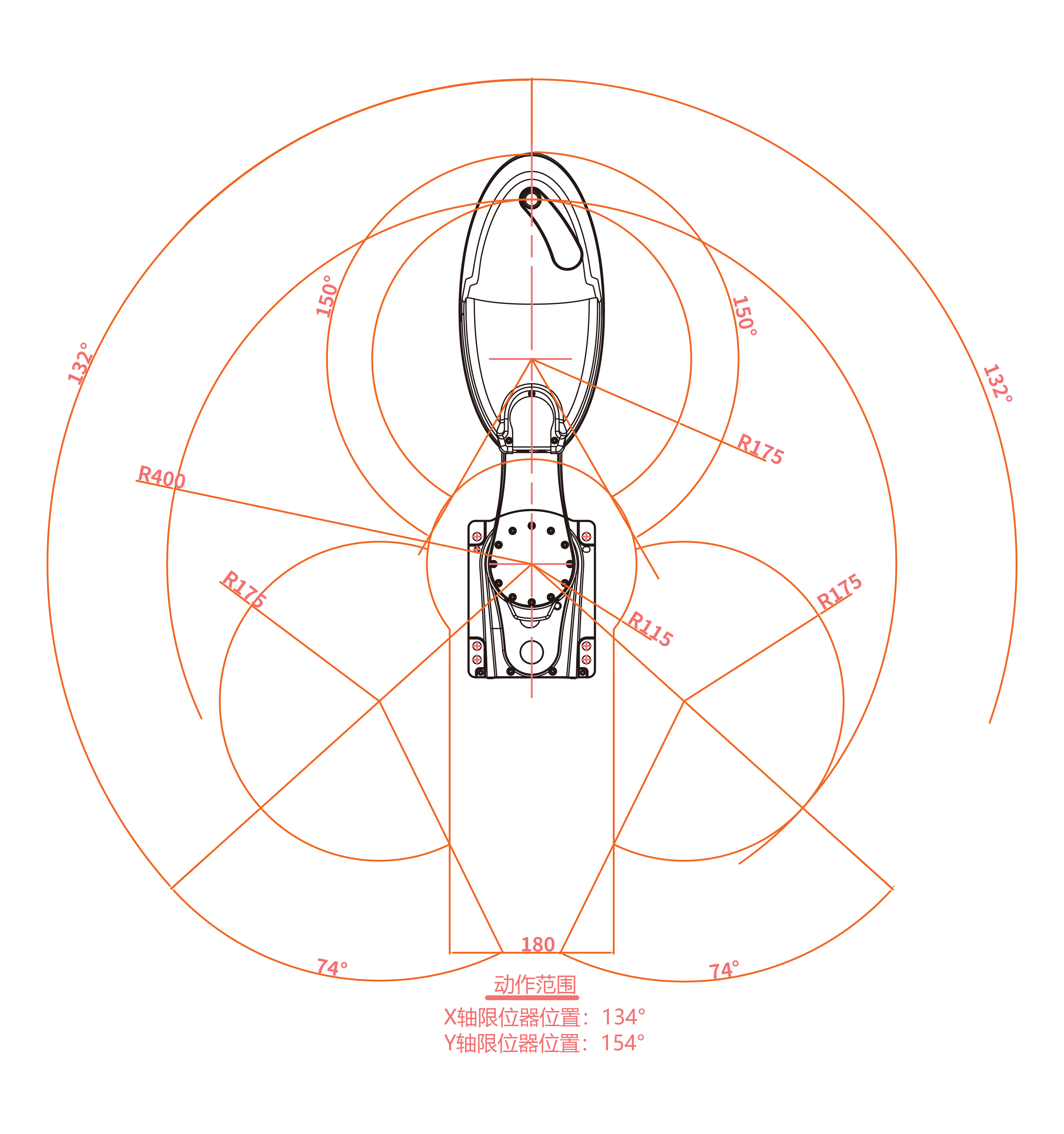 The robot has an arm range of 400mm, the upper arm rotation angle of up to ±132°, and lower arm rotation angle of up to ±150°. The working space can cover a wide sector area with a maximum diameter of 800mm, which can meet the needs of multi-station long-distance handling, sorting and assembly operations.
