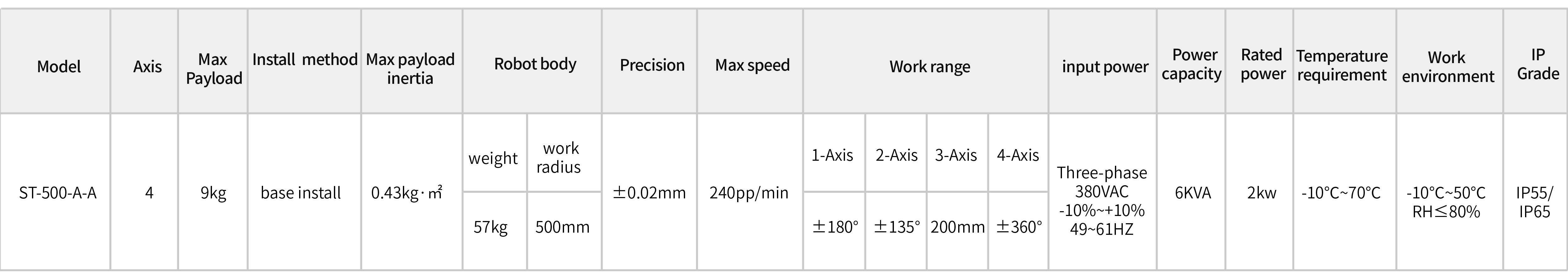 The robot arm and reducer adopt an integrated design and a unique tooth shape. While providing large load and high speed support, it greatly reduces the size of the robot arm. With the use of high-speed motors, the speed can reach up to 240ppm, and the repeatability accuracy is ±0.02mm; The robot body adopts internal wiring, strong integration, and the protection level can reach up to IP65.