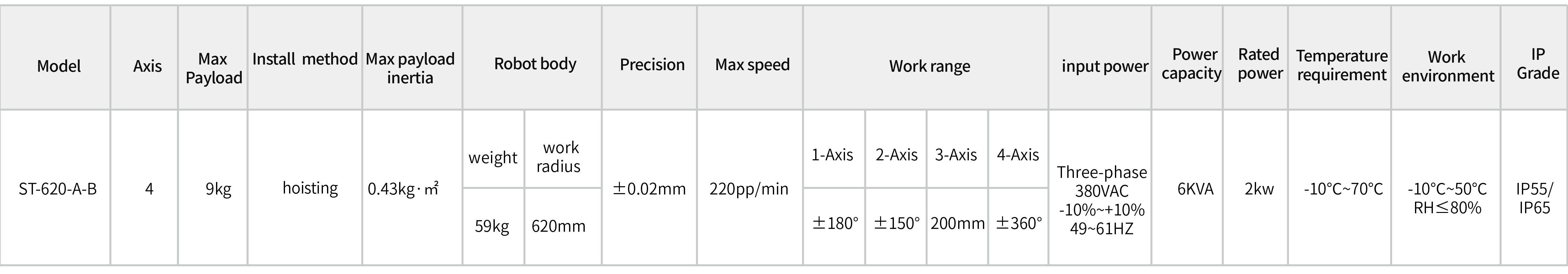 The robot arm and reducer adopt an integrated design and a unique tooth shape. While providing large load and high speed support, it greatly reduces the size of the robot arm. With the use of high-speed motors, the speed can reach up to 220ppm, and the repeatability accuracy is ±0.02mm; The robot body adopts internal wiring, strong integration, and the protection level can reach up to IP65.