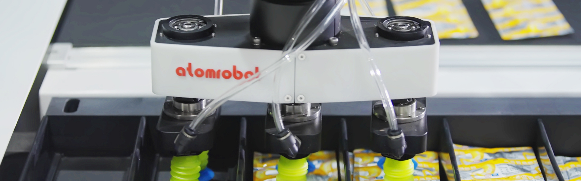 The granule sachets are transported to the bottom of the industrial camera, the visual system locates, identifies, and detects the incoming sachets, and provides OK/NG instructions and fixed positions to the robot. The robot then performs high-speed tracking, picks, and places them into the slot. The sachets are packaged by auto cartoner, and the automated process is completed.